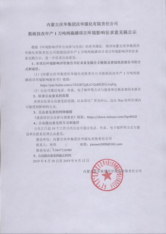 內蒙古慶華集團慶華煤化有限責任公司脫硫技改年產1萬噸純硫磺項目環境影響征求意見稿公示