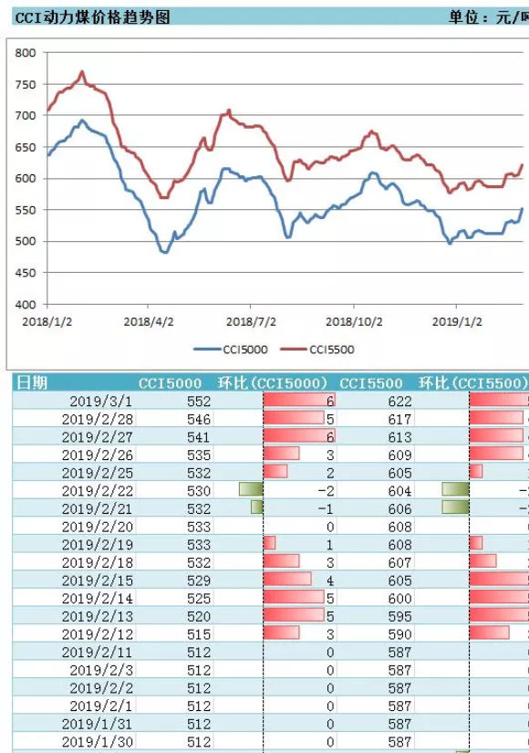 3月1日中國煤炭資源網(wǎng)最新一期的CCI動(dòng)力煤價(jià)格顯示,CCI5500動(dòng)力煤價(jià)格報(bào)622元/噸,連續(xù)五期持續(xù)上調(diào),較上期價(jià)格上調(diào)5元/噸,較上月同期價(jià)格上調(diào)35元/噸或6.0%;CCI5000動(dòng)力煤價(jià)格報(bào)552元/噸,較上期價(jià)格上調(diào)6元/噸,較上月同期水平上調(diào)40元/噸或7.8%。
